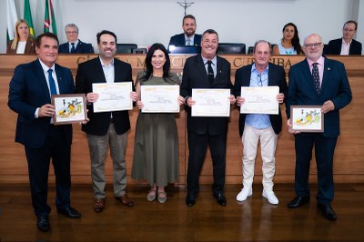 Além dos diplomas, a sessão foi marcada por um gesto de memória cultural: ao final, os homenageados receberam uma réplica de obra de Poty Lazzarotto, escolhida como lembrança do evento. “Nós vamos entregar ao final uma obra do artista paranaense Poty Lazarotto”, anunciou Nauiack, ao explicar que a peça dialoga com marcos visuais da cidade e com a identidade do Paraná.