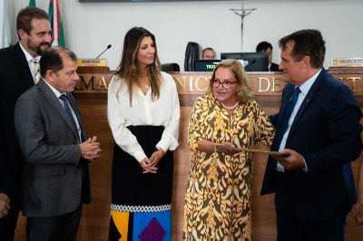 Regina Kracik Teixeira, neta do vereador João Kracik Netto, recebida por vereadores no Palácio Rio Branco para a entrega de álbum histórico. (Fotos: Rodrigo Fonseca/CMC)