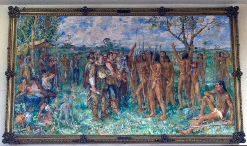 Tela Fundação de Curitiba, de Theodoro de Bona, que está no Colégio Estadual do Paraná. Com os colonizadores portugueses, cacique Tindiquera indica local da fundação da Vila de Nossa Senhora da Luz dos Pinhais. (Foto - Irene Roiko)