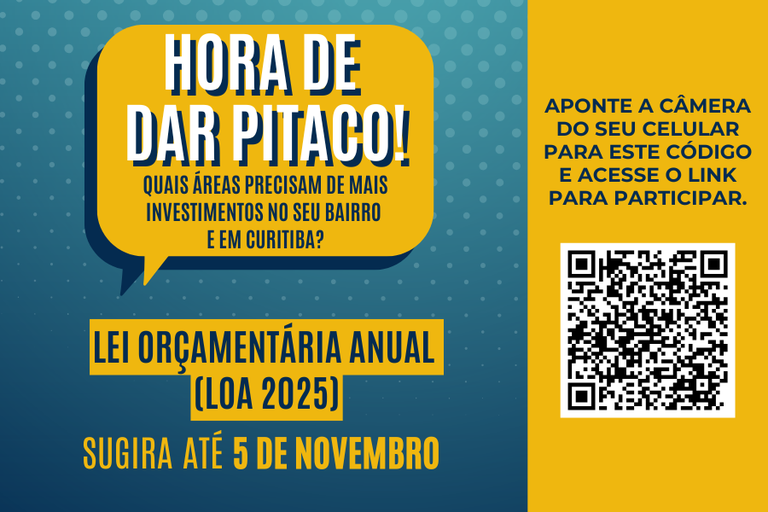 “Hora de dar pitaco” é o tema da campanha da consulta pública em 2025. Os resultados da consulta pública serão apresentados em audiência pública durante a sessão plenária, dia 12 de novembro. As sugestões da população auxiliam os vereadores a destinar sua cota de emendas à LOA 2025. Protocolado pela Prefeitura na Câmara de Curitiba no dia 30 de setembro, o projeto de lei estima o orçamento recorde de R$ 14,5 bilhões para a cidade, no próximo ano (saiba mais).